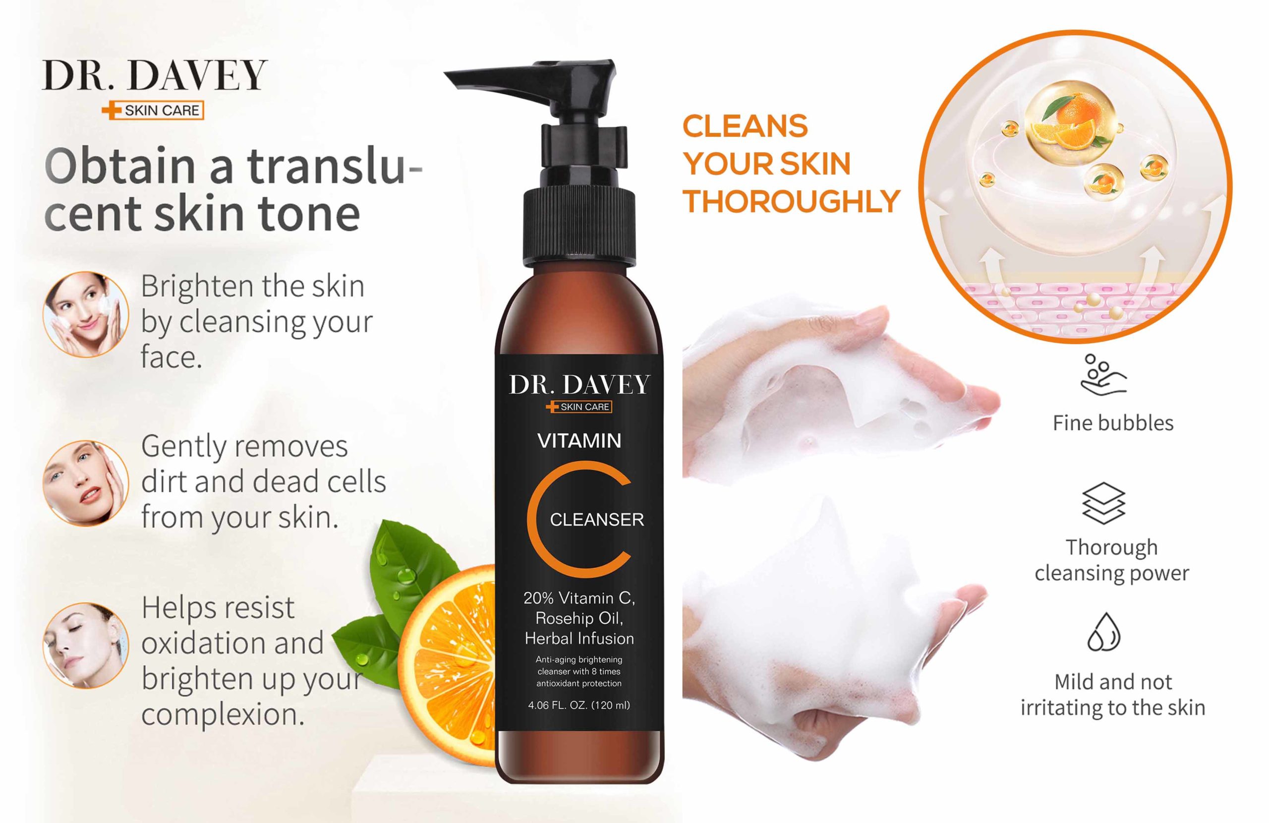 - BLEMISH DEFENSE – Our Vitamin C Cleanser is a gentle facial wash that helps clear and unclogs pores, breakouts, and blemishes. The ingredients in this acne face wash helps to cleanse away dulling skin cells, fade the appearance of sunspots, discoloration, and damage that comes from prolonged sun exposure.