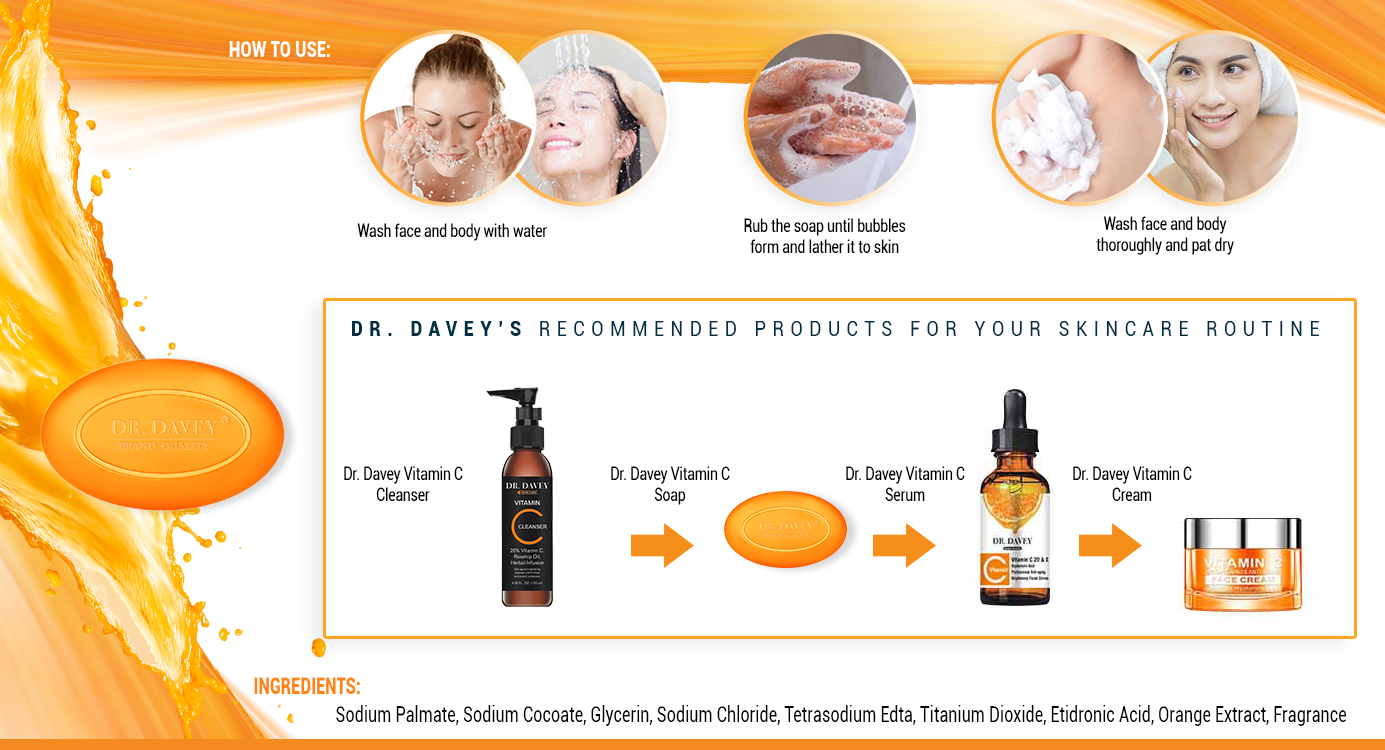 - BEAUTIFUL BRIGHT COMPLEXION-You can now have the beautiful, bright complexion of your dreams with this skin-brightening soap. Dr. Davey Vitamin C Soap will serve you radiant skin and a youthful glow.
